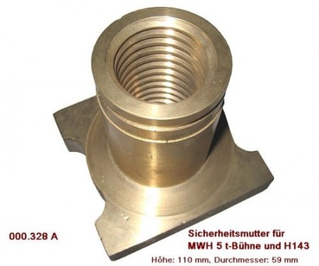 | You are purchasing a safety nut for MWH/Consul 2 post lift. The exact amount you can enter below the price under number. The safety nut also suitable for MWH Consul lifting platform type H143S. Dimensions: trapezoidal thread 45 mm (Spindle diameter) x 6 mm (thread lead), 110 mm heigth, 59 mm diameter. Other parts available for purchase in our shop by clicking on the appropriate Shop Category. After you put the product to the cart, you can purchase additional products in our online shop. We also answer questions via email: admin@awt-shop.de or phone: +49(0)176/21193525 and +49(0)38295/774067. |