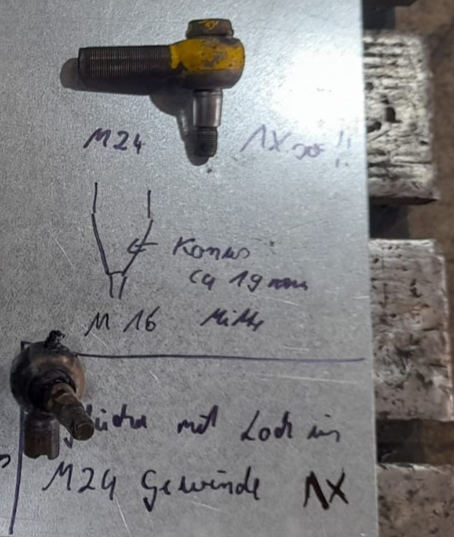 1 x tie rod (steering) for Takraf front forklift type DFG 2002 / 3N-W. Attention: Please check the head diameter (48 mm), taper (M16), and length (109 mm) before purchasing. Thank you!