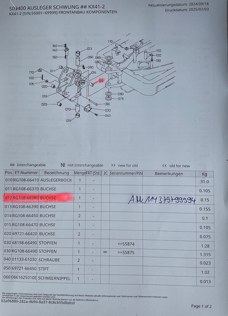 1x bearing bush item 012 for boom block Kubota mini excavator type KX41-2S (V) second generation KUB No. RG108-66380 or RG108-6638-0.