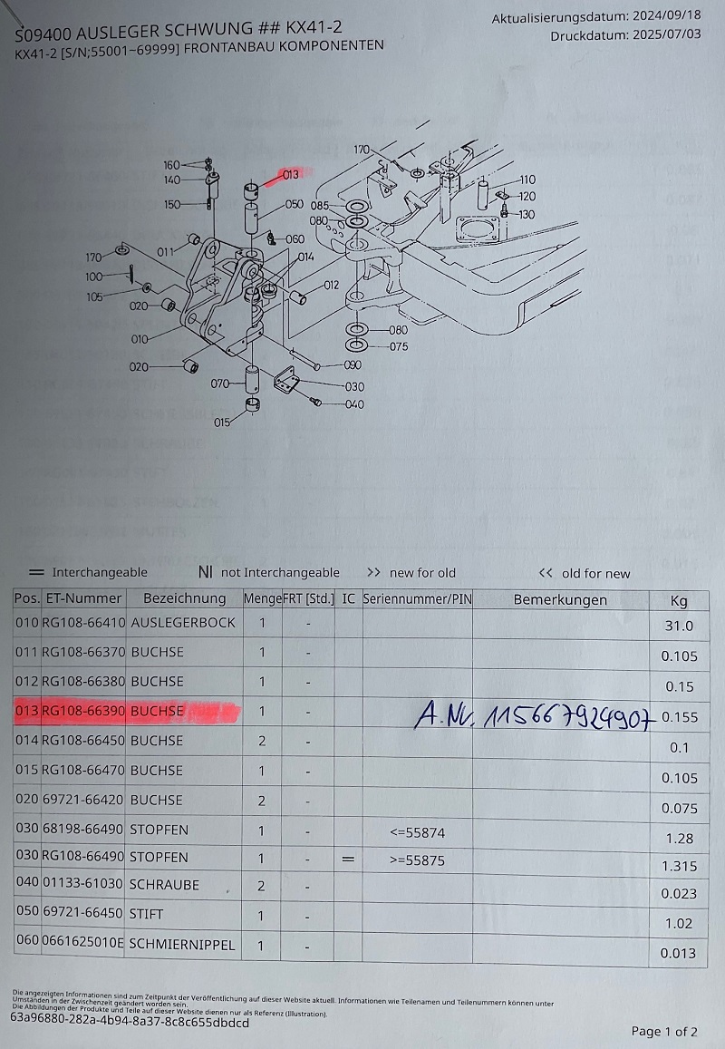 1x bearing bush for boom bracket Pos. 013 Kubota mini excavator type KX41-2S (V) second generation KUB No. RG108-66390 or RG108-6639-0.