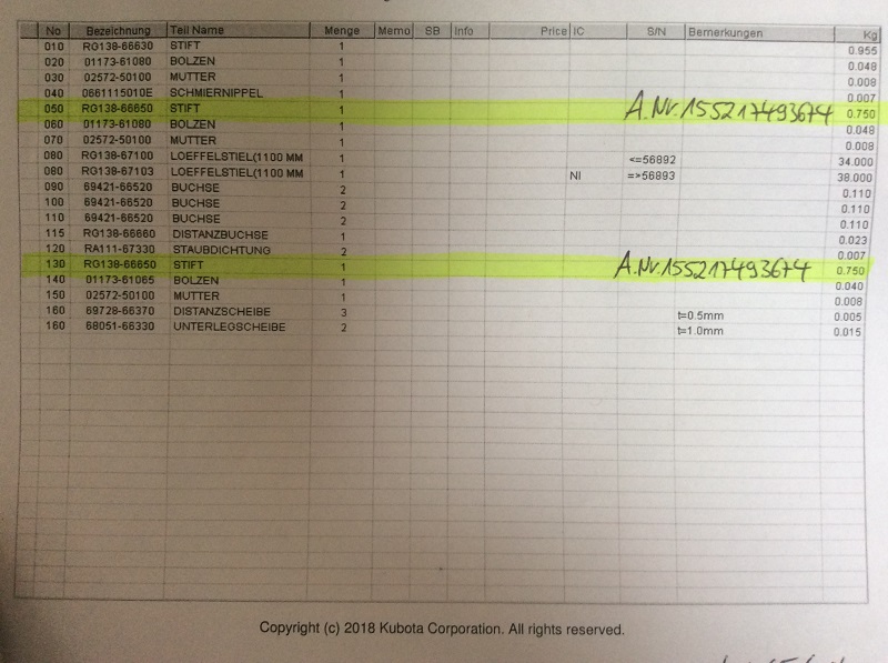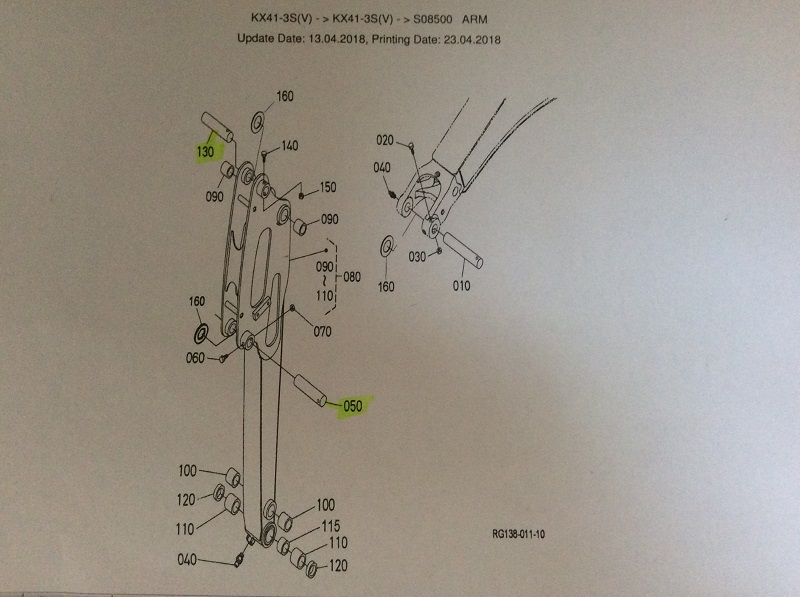 1x original bolt (pin) for upper end dipperstick boom & bucket cylinder Kubota mini excavator type KX41-3 / Alpha / S(V) third generation KUB No. RG138-6665-0.