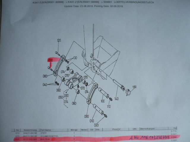 You are purchasing a fastening screw (position 030) on the swing arm for bucket mounting, etc. Kubota KX41 / KX41-2 deflection bracket for mounting arm.