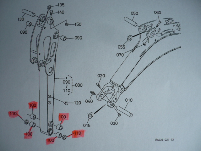 You are purchasing a set of bushings and bolts for the dipper arm-bucket connection, among others Kubota U 15-3 various bushings/bolts for extending the boom arm & bucket connection.
