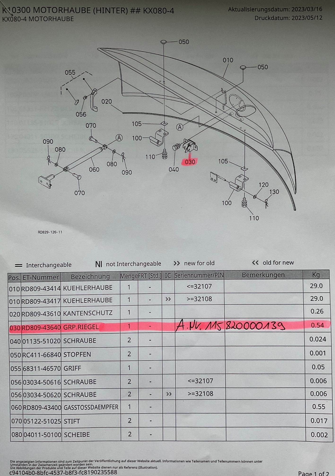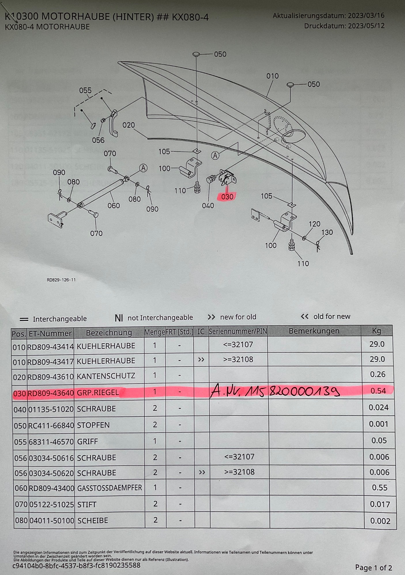 1x lock bolt for bonnet Kubota mini excavator type KX080-4 (key) fourth generation KUB. No. RD809-4364-0.