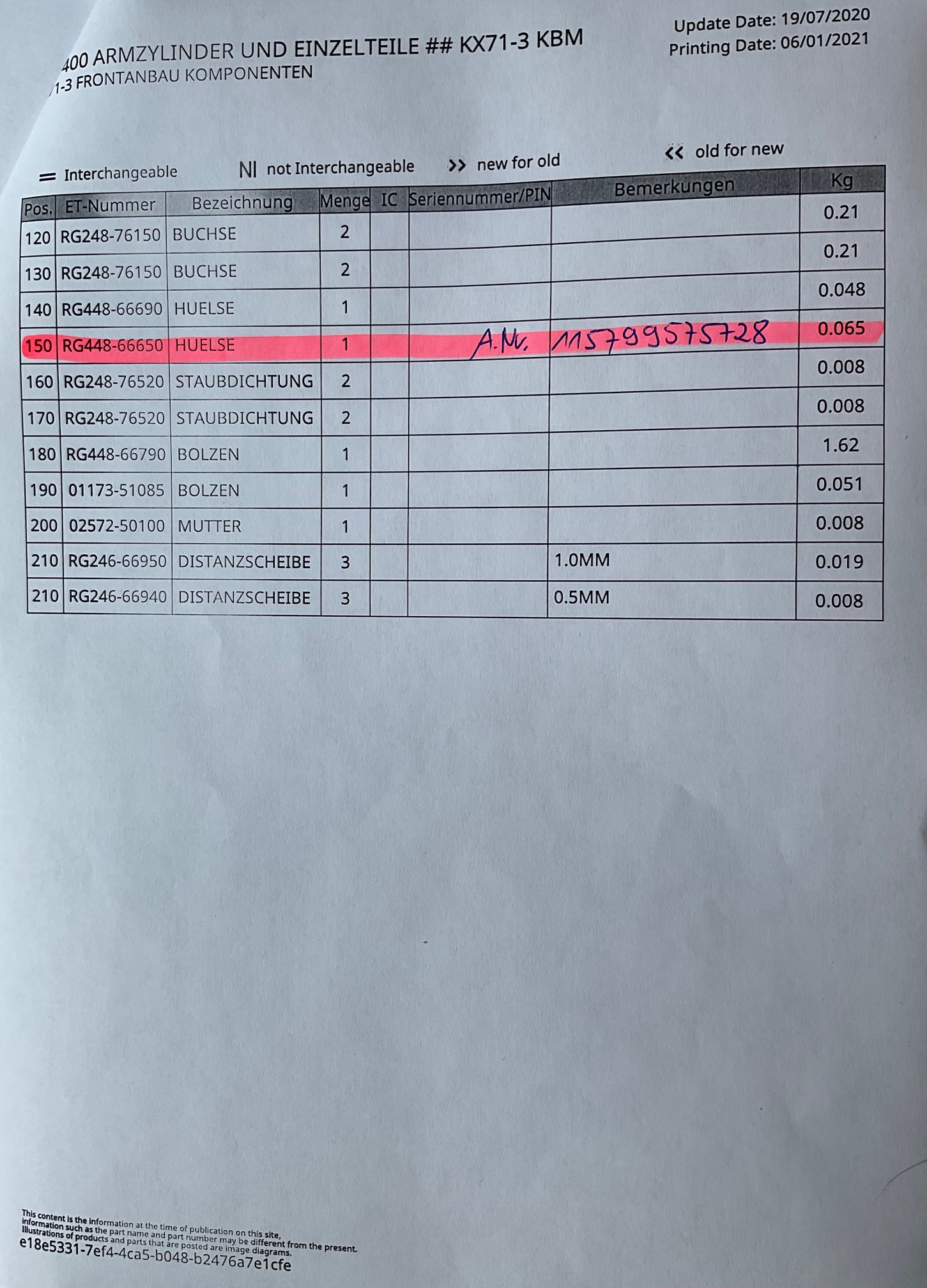 1x steel bushing for stretching dipper arm Kubota KX71-3 series (item 150 on exploded drawing) for Kubota mini excavator type KX71-3 third generation KUB No. RG448-66650 or RG 448-6665-0.
