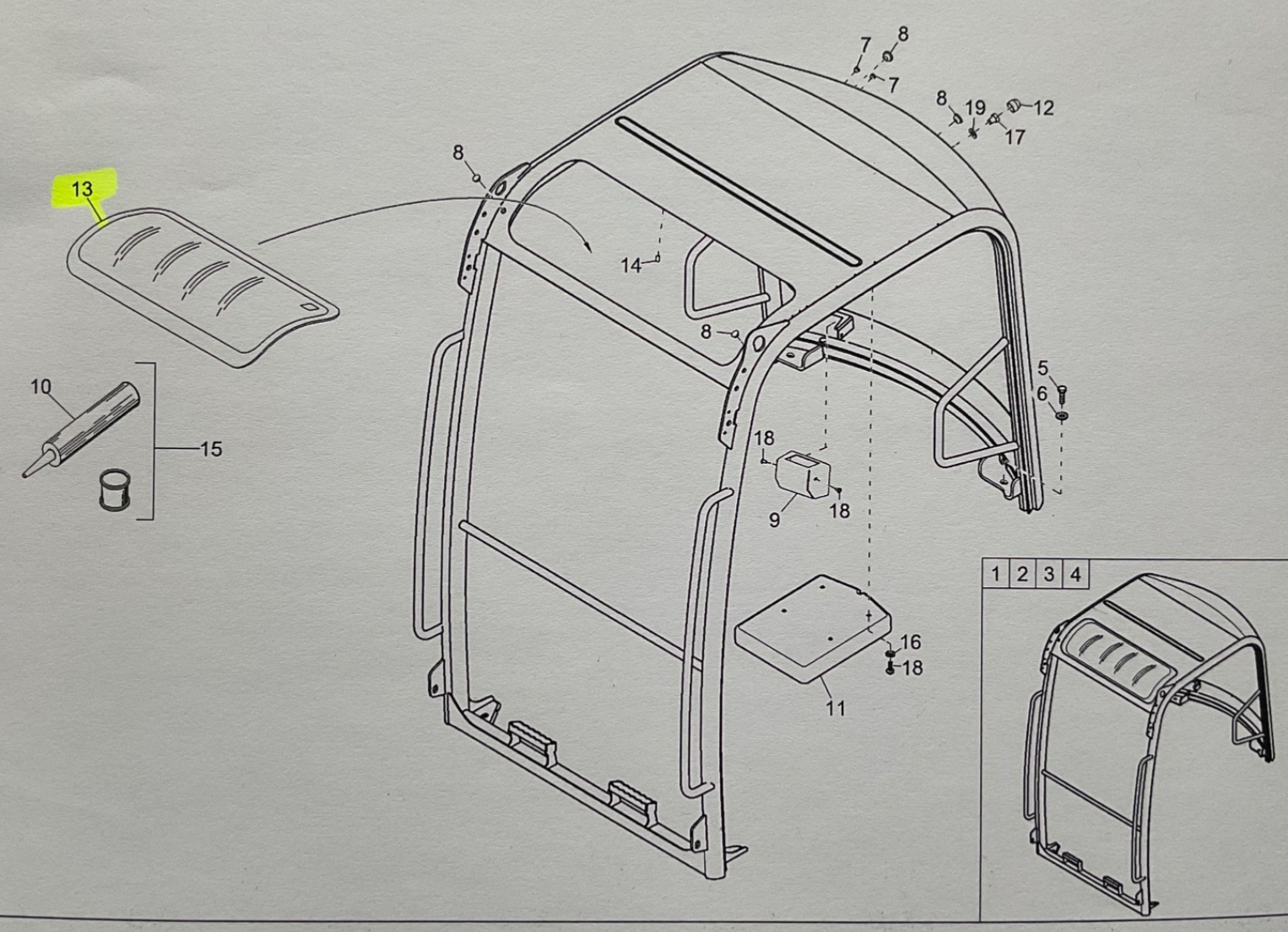 You are purchasing A safety glass panel for the cab roof, as used in the ET24 excavator (roof glass, glacede toit).