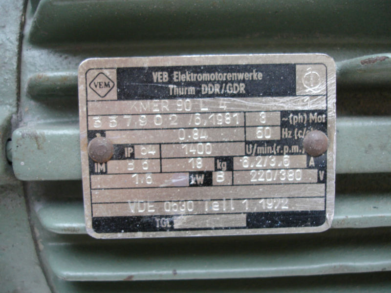 Motor-Data: Motor No. Type KMER 90 L4, 220/380V, 6,2 / 3,6 A, 1,5 KW, 1400 rev / min, 50Hz, 18kg, IP64. Shaft diameter 24mm, width 8mm wedge; flange hole spacing 146mm, 50mm wavelength. Overall length (without shaft) 25cm.