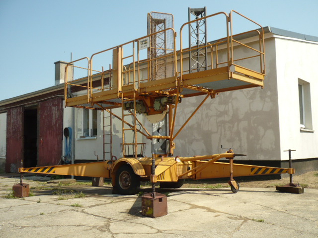 (The device has been built to raise four persons + 80 kg payload or a GG 400 kg to levels that can not normally be reached by ladders. , The platform consists of a mobile trailer base with torsion bar axle , 2 air tires, a work basket and a maintenance-free greasy pole . )