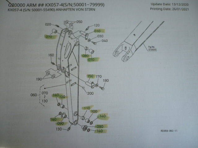 1x bolt set kit & bushing set dipper handle KX series (all positions underlined on exploded view) for Kubota mini excavator type KX 057-4 (serial number >50969) & U55-4 fourth generation KUB No. NZB171059.